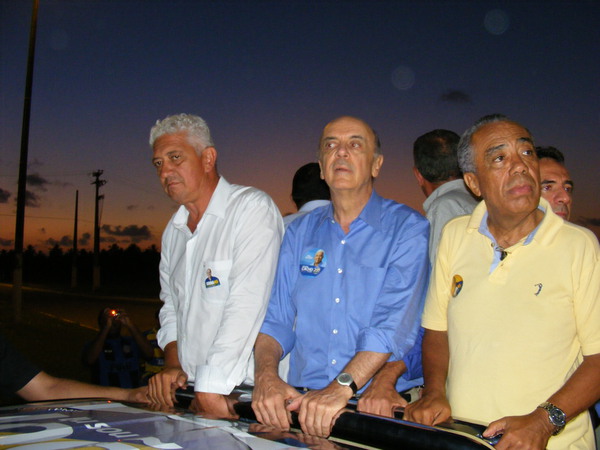 Serra, em Sergipe, ao lado de João Alves (de camisa amarela) e Emanuel Cacho (candidato a senador pelo PPS); mais tarde, Serra recorreria a Alves para calar Cacho, orador “inconveniente”, em um palanque em Itabaiana. Foto publicada no Amigos do Presidente Lula.